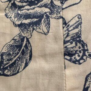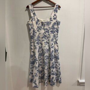 Cotton blend midi dress from Joie in a beautiful blue and white floral pattern. There are two stains on the dress, one on the front that is barely noticeable and one on the back zipper clasp that is hidden when worn (see last two photos).