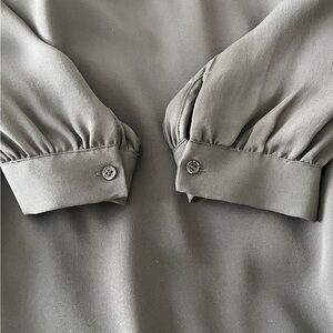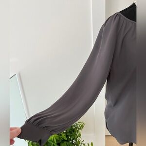 Joie dark grey silk blouse has a low scoop neck front and back with a tie at back of neck and 3/4 length sleeves with button cuffs. A loose flowy top, relaxed fit. High low hem.