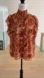 Joie blouse in a copper colour with metallic thread and an abstract botanical pattern. Lined with a sheer flowy overlay. Short sleeve flutter sleeves with ruffles. The neckline is high, smocked and has 3 buttons. Keyhole detail. Pullover style.