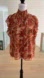 Joie blouse in a copper colour with metallic thread and an abstract botanical pattern. Lined with a sheer flowy overlay. Short sleeve flutter sleeves with ruffles. The neckline is high, smocked and has 3 buttons. Keyhole detail. Pullover style.
