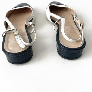 Chic and timeless, these designer JONAK ballet flats feature a navy blue leather cap toe with a crisp white leather body. Their open-back design with adjustable straps adds a modern, elegant touch. Made in Portugal with fine craftsmanship, these shoes are a stylish and versatile addition to any wardrobe.