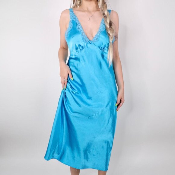 ⋆ Bright blue satin-like lingerie nightgown featuring lace trim on the bust area with rose / flower pattern w/ a small little bow in the center + rhinestone. Can be worn for a casual evening out outfit or silky sleepwear pajamas. Adjustable straps. Jones New York.