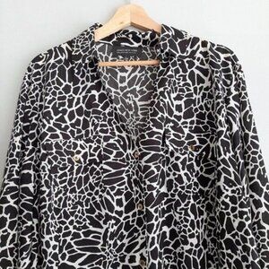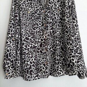 • Long sleeve button down utility sleeve top in black and white abstract flower pattern. Roll-up utility sleeves and gold tone buttons. Perfect as a light summer shacket.