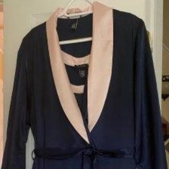 Soft, silk-like polyester nightgown and robe, knee-length. Deep blue with pale pink trim. Size XL, like new.