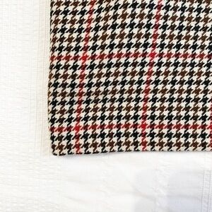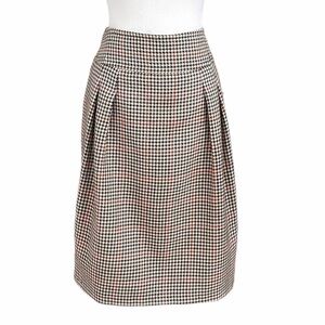 JONES NEW YORK WOOL BLEND WHITE BLACK BROWN RED HOUNDSTOOTH HIGH RISE PLEATED FORMAL SKIRT, a vintage yet trendy contemporary houndstooth pattern wool blend pleated skirt - lined - zip up on the side - not stretch and fitted - above the knee length - chic and distinguished - crisp fall and winter favorite formal business skirt with a blazer, pumps or flats - stocking and a blouse.