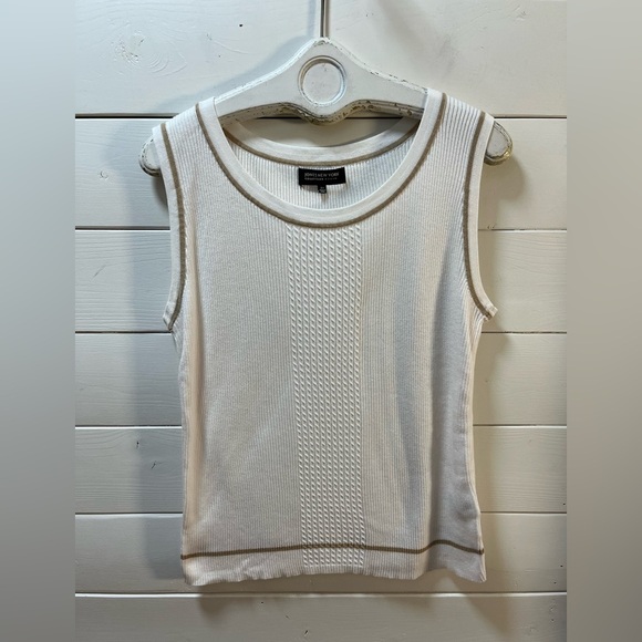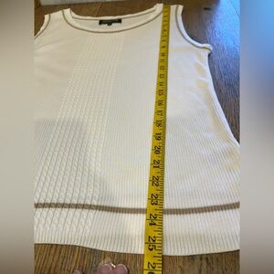 Soft white sleeveless knit top featuring a ribbed texture with a delicate cable pattern at the center. Subtle beige trim adds a refined touch. A timeless and versatile piece that pairs perfectly with blazers, cardigans, or casual denim. Excellent condition.