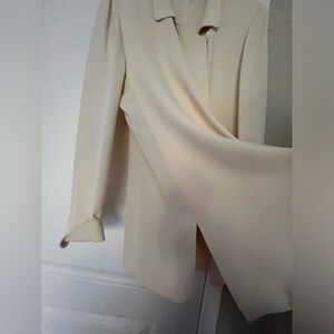 Made in Canada 🇨🇦 Buy Canadian! This is a two-piece blouse jacket and knee to midi length skirt. Jones New York Timeless & Classic, elegant and flowy. Great as an elegant business chic outfit or formal dressy events. tags: business professional, formal, Mother of the Bride, maid of honour outfit, meeting outfit, wedding, bridal, formal, ceremony, birthday, anniversary, celebrations. Jacket size: 14 measurements approx: 30” long , 26”arm length Skirt size: 12 measurements approx 34” long with a slit at back 13.5”. Material 70% viscose 30% polyester Details: - blouse has thin shoulder pads, collar, button closure - off white, ivory colour - 2 buttons on inside inside and 2 outside - lined interior with sheer fabric - sleeves with side slit - skirt is lined with back slit Condition: Very Good, excellent quality, no damage. Worn once. It has a few minor dot stains, can be dry cleaned. (see photos) From smoke-free, pet-free home. Offers welcome, bundle to save!