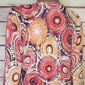 Get noticed with this colorful dot-circle cardigan with ¾ length sleeves. Looks great with a black tank or white tank.