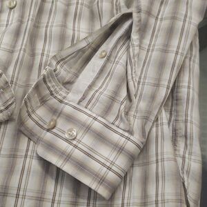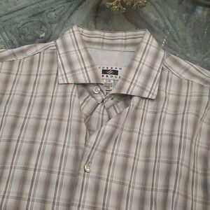 VERY NICE LIKE NEW DRESS SHIRT OF A POPULAR BRAND FEATURING EARTHY COLOR PLAID DESIGN MODERN CUT COLAR, BEAUTIFUL!