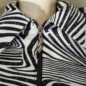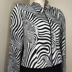 Stylish black and white women's top with a unique zebra pattern. Flat circle Paillette sequins. Zip front and pockets.