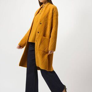 For guaranteed warmth and impeccable style, this luxuriously soft feather yarn sweater-knit coat has you covered—literally. An unexpected diagonal stitch pattern adds a touch of je-ne-sais-quoi, while the raised neckline exudes sophisticated allure. The classic straight silhouette ensures clean, flattering lines for a timeless look.