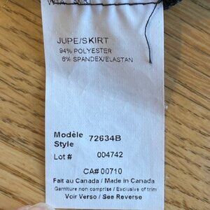 Pre-owned outfit in excellent condition. Jacket is a long-sleeved zip-up, with a collar, and the fabric is an abstract design in red, black, ivory, and gold highlights. Black midi-length skirt has elasticized waist with pleat inserts to maximize sway with movement. Both size 10, hand-washable (or gentle cycle), and the fit is very forgiving and flattering. Jacket is lined so inside seams are finished, and zipper can unzip from the bottom for comfort when sitting. The gold thread in the jacket gives a subtle shimmer, which is exaggerated in close-up photos to show that there is actual glitter. The skirt has straps for hanging on hanger. Measurements when flat: jacket between shoulders 40.7 cm. (16 in.), between pits 48.3 cm. (19 in.); skirt waist 36.2 cm. (14-1/4 in.), waist to hem 65 cm. (25-1/2 in.).