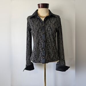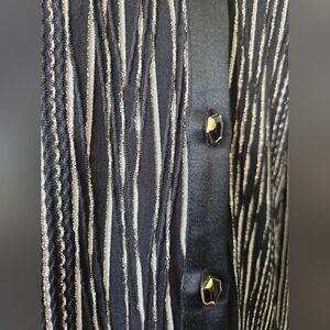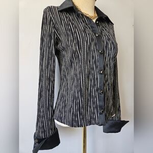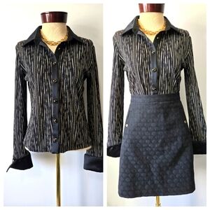 Gorgeous vintage black and metallic gold blouse. Stretchy material. Amazing buttons and French cuffs. Satin collar and cuffs.