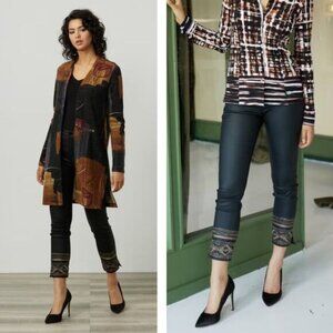 These Joseph Ribkoff casual slim fit jeans are a sleek addition to elevate your everyday wardrobe. Crafted from lightweight, high-quality fabric, they offer a snug fit from the waist to the hips, tapering down to a 3/4 length for a timeless style. The metallic slit detail and geometric pattern add a touch of intrigue, making these trousers perfect for semi-formal occasions or an evening out. They're the perfect choice to showcase your sophisticated smart style!