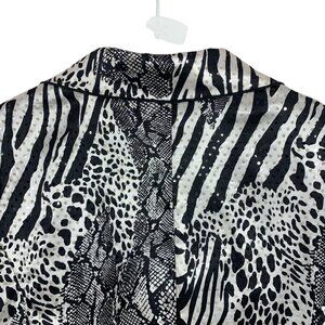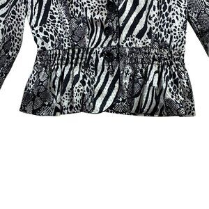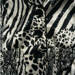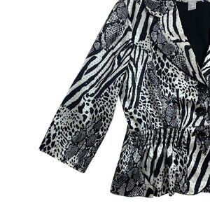 The blazer incorporates a mix of zebra and snakeskin patterns in black and white.