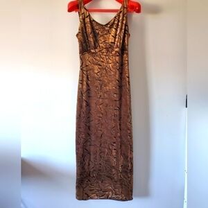 Nothing will take you back to the 90s more than crushed velvet double strapped dresses. This one is beautiful and in fantastic condition. Brown crushed velvet with black vines. Slit up the back with a comfortable lining. Made in Canada by renowned designer Joseph Ribkoff.