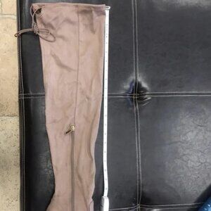 A sassy over-the-knee boot featuring soft vegan suede uppers fastened by a tie-at-back detail and a sleek covered block heel.