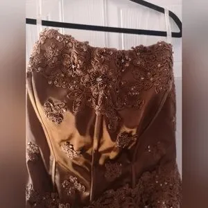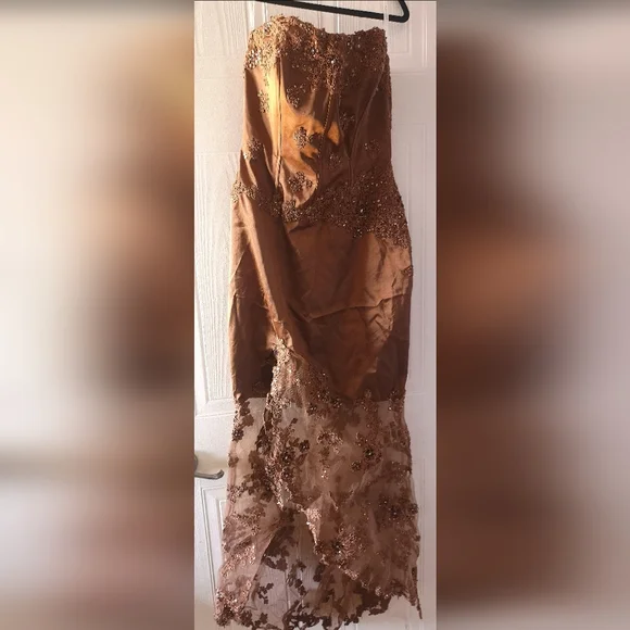 Beautiful JOVANI DRESS. Strapless. Mermaid style. Embroider and sequined dress. Tuile at a bottom and it is transparent. Slit at a bottom on one side. Dress is ripped in a slit area but can be easily fixed (look at pictures. I circled ripped area). Size 10. Rich brown color.