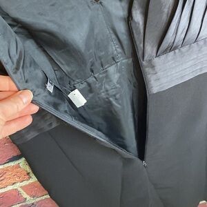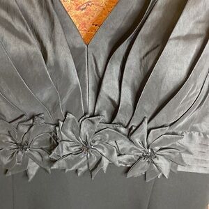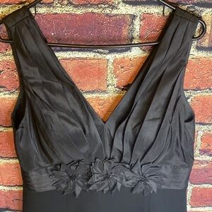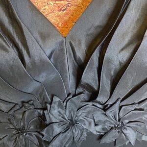 It’s a chiffon material on the bottom. It is lined. The top is a satin material with a beautiful floral detailing around the waist. The sweetheart neckline is in the front and back. Zipper in the back. This is a classic, sexy, timeless piece. Very nice quality. Great for any formal event, wedding guest, bridesmaid, mother of the bride, prom, homecoming, bachelorette party or even a girls night on the town.