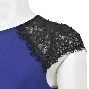 Stunning JS Boutique Sheath Dress in a rich shade of purple, accented with elegant black lace and beaded sleeves. The dress is expertly crafted with a flattering sheath silhouette that hugs the curves in all the right places, creating a sleek and sophisticated look.