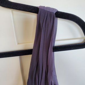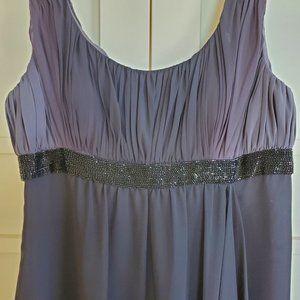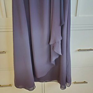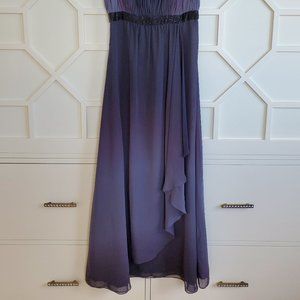 JS Boutique long evening dress in purple Ombre; Size 6. Sleeveless with pleated shoulders which drape down to beaded Empire waist; invisible back zipper. Top layer is Sheer fabric. Front swirl sheer fabric drapes along centre front. Ombre purple color. Never worn.