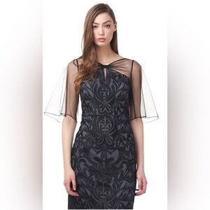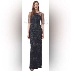 Embroidered mesh, flared elbow sleeve illusion bow column gown.