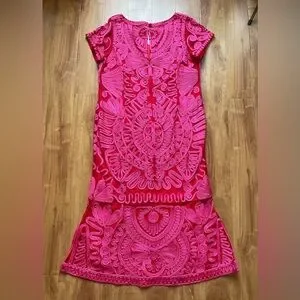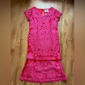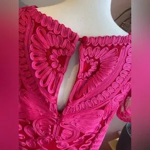 This stunning pink gown by JS Collections features a sleeveless design with a ruffled V-neckline, perfect for cocktail parties or a night out. The maxi-length silhouette flows gracefully, showcasing intricate lace-like patterns that add a touch of elegance and femininity.