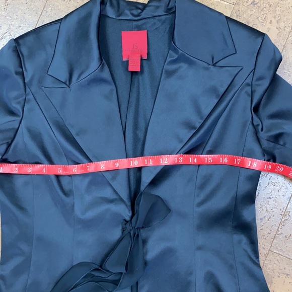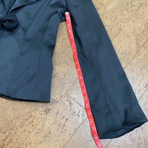 EUC! 8.5/10 This stunning black blazer with a sheen can be worn for a more formal event. The sleeves are pretty long and wider at the bottom! It is fully lined! Cute silky bow! Wilder lapel collar!
