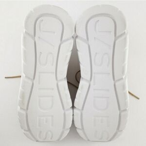 New, J/Slides NYC women's Knockout sneakers with a sand leather upper and white chunky platform sole, size 7.5M.