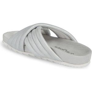 Razored treads add a hint of utilitarian style to an essential slide sandal with supple, channel-quilted leather straps.