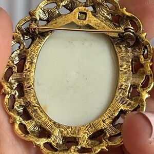 Victorian oval porcelain brooch with ornate metal trim. Features flowers.
