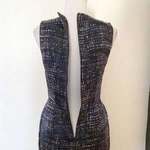 JUDITH & CHARLES 100% SILK BLACK BLUE WHITE ABSTRACT PATTERN SLEEVELESS SATIN SHEATH FORMAL DRESS, a black white and blue abstract pattern allover sleeveless sheath formal satin dress - 100% silk - lighweight - lined - not stretch - fitted and bodycon yet sleek and chic, crisps, sophisticated, elegant with a twist- back zipper fastening (concealed), perfect spring and summer formal dress for a wedding, family reunion, fancy dinner at a restaurant, gala, night out, cocktail hour or event a feminine workwear business look with a black blazer for a day to night dress on a thursday - with black or white shoes and purse. Wearable all year long, classy, classic, timeless and contemporary.