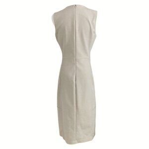 JUDITH & CHARLES BEIGE CREAM SLEEVELESS SHEATH MIDI FORMAL DRESS, this is a minimalist neutral crisp sophisticated beige / cream sleeveless sheath midi formal dress - round neckline - back zipper fastening - unlined and stretch yet super sleek and fitted with seaming details that created a large hemline at the bottom yet super subtil and classic- classy - old money perfect business to fancy night out socialite dress with heels. Versatile, go to dress.