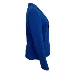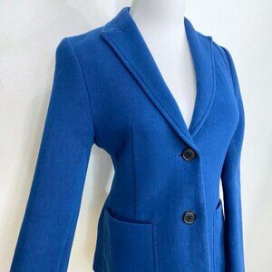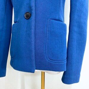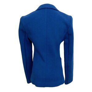 JUDITH & CHARLES NAVY EMERALD COTTON BLEND SOFT SHELL SINGLE BREASTED BLAZER , this is a navy / emerald tone single breated peak lapel blazer in a soft cotton blend shell - 2 button front closure - big patch front pockets - unlined - stretch - long sleeves with nothing at cuffs - no shoulder pads or back vent for a sleek minimalist business to business casual regular length blazer - business / career / job / work /office perfec blazer over a button down shirt and a coordinated pencil skirt or dress pants - dare it over a sheath dress and for a formal conventionnal classic event. Timeless, contemporary, versatile - staple - must have, great alternative to the black blazer.