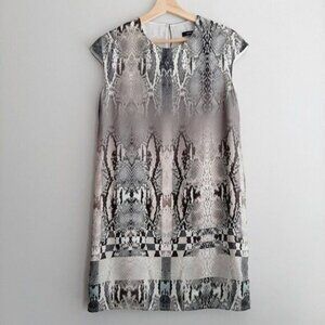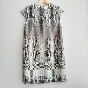 • Sleeveless crew neck dress in neutral reptile print. Black, grey creamy white and hints of blue with back one button closure.