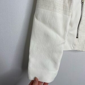 In great condition. 56% viscose 46% acetate completely lined. Front zipper pockets. Beautiful white sheen texture fabric. Great quality. Tailored with Love in Canada. Measure lay flat: shoulder 15'' bust 17,5'' length 21'' sleeve length 23,5''.