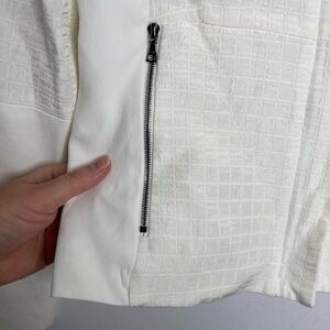 In great condition. 56% viscose 46% acetate completely lined. Front zipper pockets. Beautiful white sheen texture fabric. Great quality. Tailored with Love in Canada. Measure lay flat: shoulder 15'' bust 17,5'' length 21'' sleeve length 23,5''.
