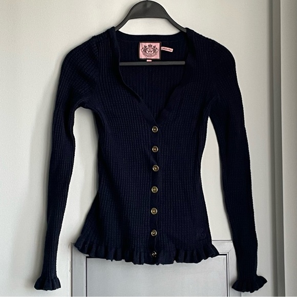 JUICY COUTURE Navy Ribbed Button-Up Cardigan with Ruffles
