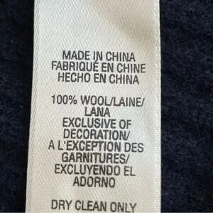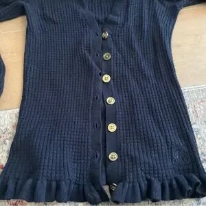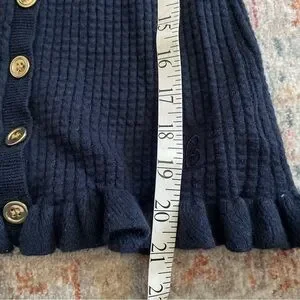 Stylish navy waffle like texture cardigan with gold button-up front. Features ruffled hem and cuffs.