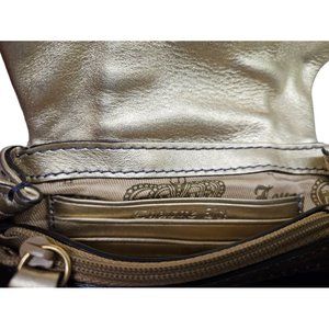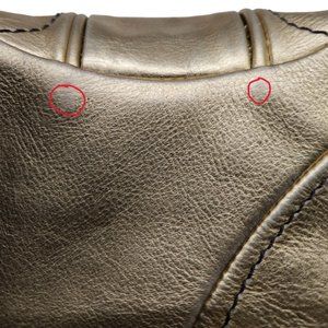 ○ Exterior: Gold cowhide leather (gold colour has a silver undertone to it) & antiqued finish Gold/Brass colour metal hardware. Leather wristlet strap. Magnetic flap opening in leather embellished w/ a crystal-like keyring that opens/closes. Gold metal lettering spells out “Juicy”. Leather is accented with black stitching on front, back & on strap.