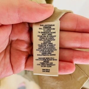 This double-breasted trench features military-inspired epaulets, 3/4 sleeves with ruffled cuffs, & traditional gold-buckled matching belt wraps the natural waist. Side-entry pockets with button-flap detail. Polka dot inside piping and lining. Single back pleat with buttoned flap. Shell: 99% cotton 1% spandex. Lining: 100% cotton