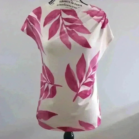 • Style: Pullover, Fuchsia palm print, sleeveless, very stretchy, pleated on on shoulder for beautiful detailing, crewneck, relaxed fit