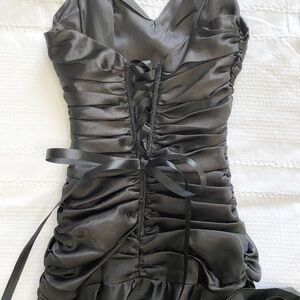 ANTHROPOLOGIE JUNO BLACK SATIN CINCHED SLEEVELESS EVENING GOWN DRESS STYLE 763, The perfect Y2K black satin sleeveless cinched bustier evening gown - open back with a victorian keyhole line detail on each side - concealed back zipper fastening - not stretch sweetheart neckline - spaghetti straps (not adjustable) lined - fit & flare style - perfect for a prom night, galas, ceremonies, red carpet, formal, crisp , elegant, sophisticated with long gloves and diamonds.