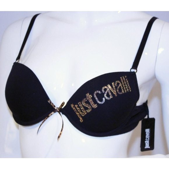 JUST CAVALLI by Roberto Cavalli PUSH-UP Padded BRA Black LEOPARD Logo & Bow 32B