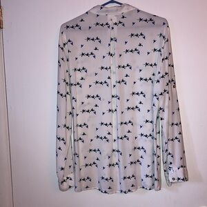 JUST living white bird blouse. Excellent condition. Cute button up with small pearl coloured buttons. Two front pockets. 100% rayon. Pleated back.