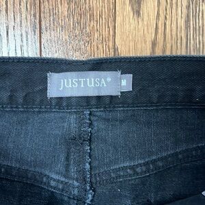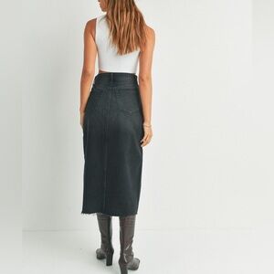 High-rise, denim midi skirt in washed black. Front slit. Waist measures 14.5”, length 33”. In brand new condition. Never worn.