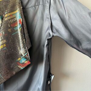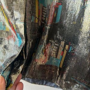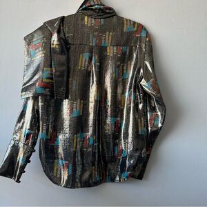 Chic metallic blouse with abstract patterns. Features a unique attached draped collar. Perfect for a bold statement.