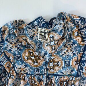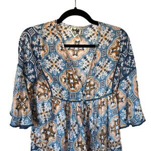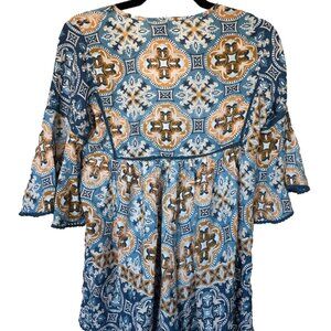 Turn heads in this breezy boho-chic playsuit featuring a stunning blue, white, and golden tile-inspired pattern. With a flattering cinched waist, flowy sleeves, and relaxed fit, this piece gives effortless summer-in-the-city or festival-day vibes.