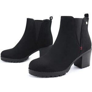 Jabasic Womens black Chelsea Block Heel Slip On Faux Suede Classic Ankle Booties