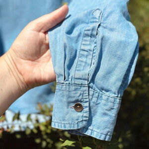 Chambray Shirt by Jachs Girlfriend - button back sleeves - fabric is tercel- tagged M but please check measurements below - pre owned- good condition PTP 19” L from shoulder 25” S 17” Width of sleeve 6” across from armpit All measurements are approximate